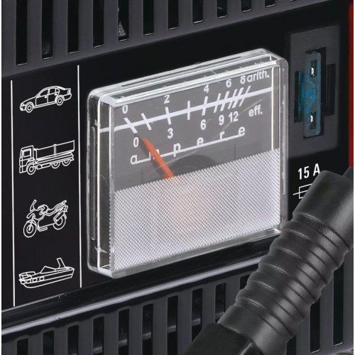 Prostownik CC-BC 10 E to wydajna, automatyczna ładowarka elektroniczna 12 V. Chwilowy prąd ładowania można wiarygodnie odczytać za pomocą wbudowanego amperomierza. Elektronika ładowania ogranicza napięcie ładowania do maksymalnie 14,1 V (charakterystyka IU), dzięki czemu przeładowanie podłączonego akumulatora jest niemożliwe, a proces ładowania nie musi być oddzielnie monitorowany. Ładowarka jest idealna do nowoczesnych, bezobsługowych akumulatorów, a także do ładowania podtrzymującego rzadko używanych akumulatorów. Dwa mocne, w pełni izolowane zaciski biegunowe zapewniają optymalny kontakt z biegunami akumulatora przez cały czas. Urządzenie można bezpiecznie i łatwo transportować za pomocą poręcznego i wytrzymałego uchwytu do przenoszenia.