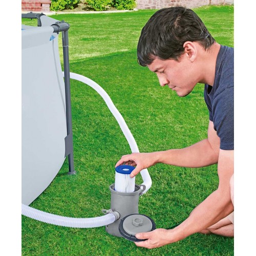 Pompa filtrująca Bestway® 1.249 L Flowclear™ jest niezbędna dla właścicieli basenów, aby woda w basenie była czysta i higieniczna w miesiącach letnich. Pompa filtrująca basen utrzymuje cyrkulację czystej wody, wypompowując ją z basenu przez wkład filtrujący i z powrotem. Dwa węże są dołączone do pompy Bestway® i są przymocowane do dwóch oddzielnych punktów na basenie. Luźny koniec jednego węża jest podłączony do wlotu pompy filtrującej, a koniec drugiego węża jest podłączony do wylotu. Woda jest wypompowywana z basenu i przez wąż wlotowy, a następnie czyszczona przez wkład filtra i pompowana z powrotem przez wąż wylotowy. Następnie rozpoczyna swoją podróż od nowa, zapewniając czystą, przejrzystą i higieniczną wodę.
