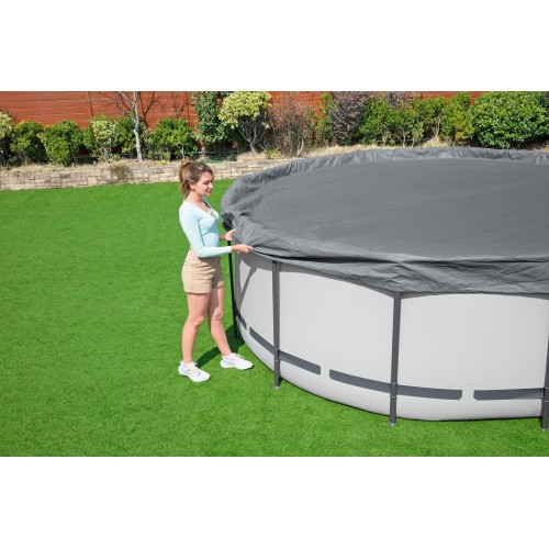 BESTWAY Pokrywa basenowa Premium ⌀ 493 cm zapewnia niezawodną całoroczną ochronę dla okrągłych basenów na stelażu o średnicy 4,88 m (16'). Po zakończeniu sezonu kąpielowego chroni basen przed liśćmi, zabrudzeniami, deszczem, śniegiem i mrozem, ułatwiając jego ponowne uruchomienie w kolejnym sezonie.