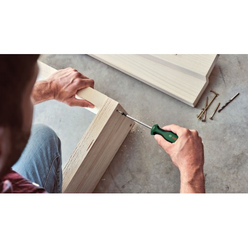Szybko i efektywnie wykonuj dowolne prace montażowe z pomocą wysokiej jakości wkrętaka Bosch – zaprojektowanego z myślą o najwyższej wydajności i maksymalnym komforcie. Wkrętak posiada grot z powłoką chromową, wykonany z bardzo twardej stali S2, który zapewnia solidny moment obrotowy:, przewyższający wymagania normy (TMD-705) o co najmniej 40%. Aby zapewnić stabilność wkręcania i lepszy kontrast wizualny, końcówka wkrętaka (58 ±3 HRC) jest magnetyczna i ma fosforowaną powierzchnię w kolorze czarnym. Dwukomponentowa rękojeść jest wyposażona w miękką okładzinę Softgrip, która poprawia komfort pracy. Sześciokątny kształt przedniej części rękojeści zapobiega się staczaniu się narzędzia. Który wkrętak Bosch do jakiego zastosowania? Wybór jest łatwy i szybki dzięki kolorowym oznaczeniom rozmiaru i typu.