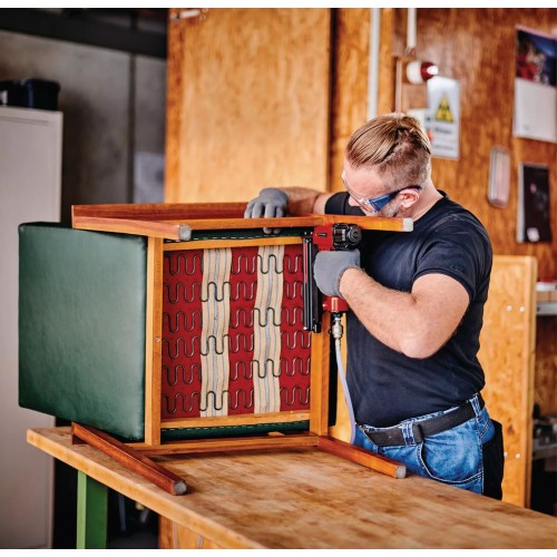 Zszywacz na sprężone powietrze Einhell TC-PN 50 to wszechstronne narzędzie do użytku w warsztatach, w domu i w garażu. Urządzenie 2 w 1 składa się ze zszywacza pneumatycznego i gwoździarki pneumatycznej i idealnie nadaje się do prac remontowych i renowacyjnych. Antypoślizgowy uchwyt umożliwia bezpieczną pracę. Zszywacz oferuje najlepszą wydajność przy wewnętrznej średnicy węża 9 milimetrów. Nos zabezpieczający zapobiega niezamierzonemu uruchomieniu urządzenia. Wskaźnik poziomu pokazuje liczbę pozostałych zszywek lub gwoździ. Zakres dostawy obejmuje 500 zszywek o długości 16/25/40 mm, 1000 gwoździ o długości 25/40 mm, 1x butlę olejową, 1x złączkę wtykową i 2x klucze imbusowe. Dostarczany w praktycznej walizce do transportu i przechowywania.
