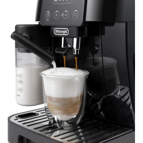 De’Longhi Magnifica Start ECAM 220.60.B Milk to w pełni automatyczny ekspres do kawy, który przenosi doświadczenie profesjonalnej kawiarni prosto do twojej kuchni. Dzięki systemowi LatteCrema Hot przygotuje gęstą i kremową piankę mleczną do cappuccino, latte macchiato i innych napojów mlecznych. Wbudowany stalowy młynek z 13 stopniami mielenia zapewnia równomierne i precyzyjne mielenie, maksymalizując aromat świeżo zmielonej kawy.
