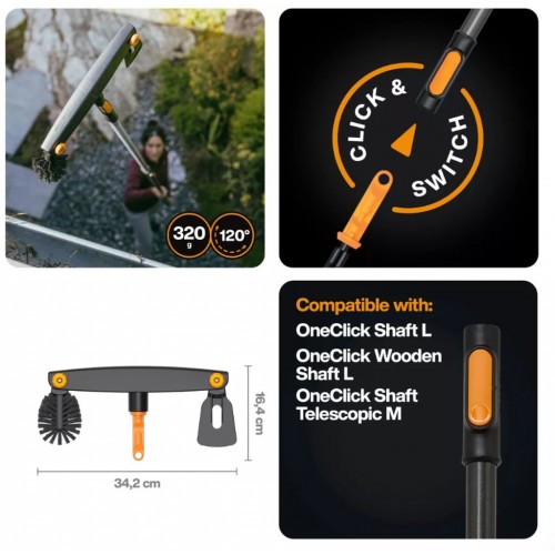 FISKARS Czyścik do rynien OneClick to praktyczne i bezpieczne narzędzie do czyszczenia rynien z poziomu ziemi. Łączy w sobie skrobak do usuwania grubych zabrudzeń i zaokrągloną szczotkę do końcowego czyszczenia. Regulowany kąt głowicy roboczej i teleskopowy trzonek FISKARS OneClick umożliwiają szybkie i ergonomiczne sprzątanie bez drabiny.