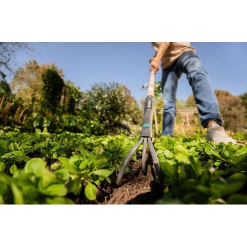 Pazurki z trzema zębami nadają się do stosowania w różnych miejscach w ogrodzie. Szerokość robocza 9 cm sprawia, że można ich używać nawet na obszarach o gęstej roślinności. Zęby umożliwiają precyzyjną pracę wokół roślin. Widły do kopania służą do spulchniania i napowietrzania gleby bez naruszania korzeni.