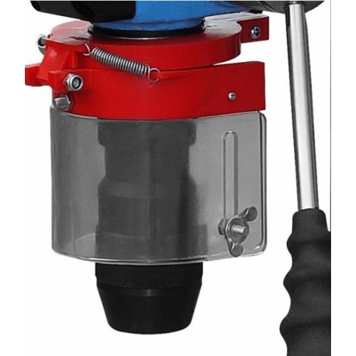 Bezpieczeństwo i precyzję zapewniają regulowany ogranicznik głębokości wiercenia, składana osłona przeciw wiórom oraz wyłącznik zeronapięciowy.