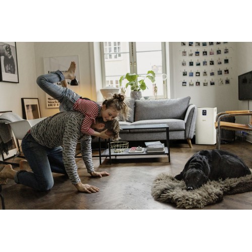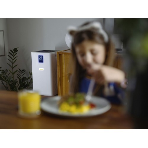 Perfekcyjne oczyszczanie powietrza w dużych pomieszczeniach, pokojach i miejscach pracy: Dzięki wielowarstwowemu systemowi filtrującemu oczyszczacz powietrza AF 50 usuwa z powietrza alergeny, zanieczyszczenia oraz patogeny. Urządzenie posiada następujące dodatkowe funkcje: Wkład z aktywnym węglem oraz wyświetlacz alfanumeryczny wskazujący ilość pyłu PM 2,5 w µg/m3 zawieszonego w powietrzu, jakość powietrza wyświetlaną w postaci kolorowego diagramu, temperaturę i wilgotność względną. Nasz oczyszczacz powietrza warto także wybrać ze względu na funkcję timera, blokadę przed dziećmi, tryb nocny i bardzo cichą pracę, a także skuteczność filtrowania, która wynosi 99,95% w przypadku cząsteczek o rozmiarze 0,3 µm, jak również wysokiej jakości czujnik laserowy w trybie automatycznym. To oznacza, że tryb automatyczny i poziom wydajności są automatycznie dostosowywane do stopnia zanieczyszczenia powietrza. Poza tym w zależności od stopnia zanieczyszczenia powietrza i intensywności użytkowania urządzenia, żywotność filtra wynosi około roku.
