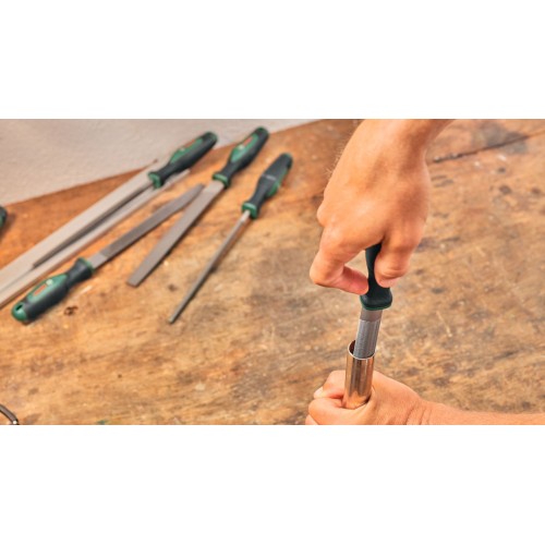 Narzędzia wykonane są z wysokiej jakości stali węglowej (63 ± 3 HRC), zapewniającej trwałość i odporność. Ergonomicznie zaprojektowane uchwyty z miękką powierzchnią chwytu i miejscem na kciuk pomagają redukować zmęczenie dłoni i ułatwiają obsługę narzędzia. Szczotka do pilników pomaga utrzymać pilniki w czystości i sprawności. Narzędzie wyposażone jest w praktyczny otwór do zawieszenia, umożliwiający łatwe przechowywanie i szybki dostęp. Pilniki są zgodne z normą ISO 234.