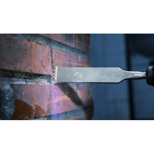 Trwałe dłuto PRO SDS plus-5C jest wyposażone w końcówkę z węglika, która zapewnia skuteczne zeskrobywanie zaprawy. Bez trudu rozbija zaprawę i umożliwia pewne prowadzenie narzędzia. Dłuto nie zakleszcza się w spoinach zaprawy i pomaga pozostawić cegły oraz ramy okien i drzwi w nienaruszonym stanie.