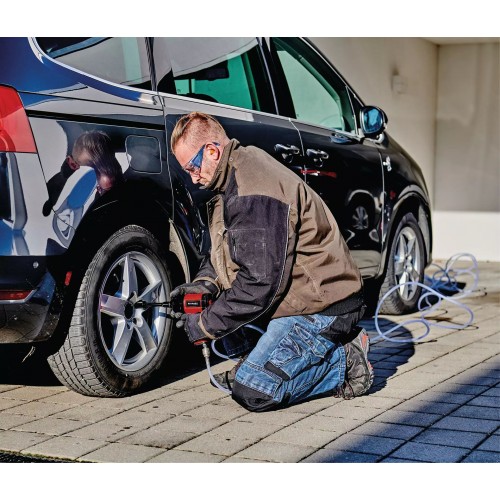 Klucz udarowy na sprężone powietrze Einhell TC-PW 610 skutecznie radzi sobie z pracą w domu, warsztacie i garażu. Dzięki wysokiej wydajności idealnie nadaje się również do wymagających zadań. Wytrzymały klucz udarowy ma maksymalny moment obrotowy 610 Nm. Antypoślizgowy, gumowany uchwyt zapewnia bezpieczną i komfortową pracę w każdej sytuacji. Wyposażony w obrót w lewo (jednostopniowy) i prawoskrętny (trzystopniowy), klucz udarowy na sprężone powietrze może być używany do różnych zastosowań związanych z majsterkowaniem. Oferuje najlepszą wydajność przy wewnętrznej średnicy węża 9 milimetrów. Maksymalne ciśnienie robocze to 6,3 bara, maksymalny rozmiar gwintu to 19 milimetrów. Zakres wyposażenia obejmuje 10 nasadek w rozmiarach 8/10/11/13/17/19/21/22/24/27 milimetrów oraz 1x butlę olejową i 1x złączkę wtykową. Dostępne jest również przedłużenie 125 mm. Klucz udarowy Einhell TC-PW 610 jest dostarczany w praktycznej walizce do transportu i przechowywania.