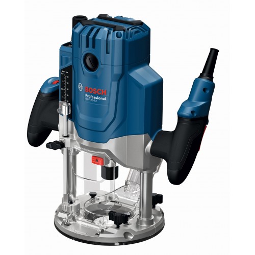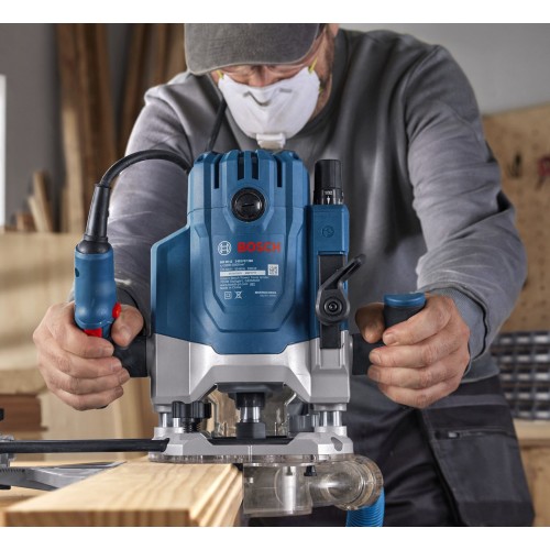 GOF 20-12 jest wyposażona w pokrętło regulacji prędkości po lewej stronie oraz blokowany włącznik na prawej rękojeści, łatwo dostępną dźwignię zanurzeniową oraz specjalne adaptery do odsysania pyłu zarówno przy frezowaniu powierzchni, jak i krawędzi.