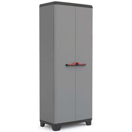 Wysoka szafa doskonale sprawdzi się w garażu, piwnicy czy na tarasie. Została wykonana z tworzywa sztucznego - polipropylenu. W środku znajdziemy cztery półki,które możemy regulować. Każda półka posiada obiążenie do 15 kg. Szafka została wyposażona również w regulowane nóżki, które pozwolą nam ustawić mebel nawet na nierównym podłożu.
