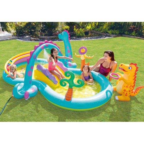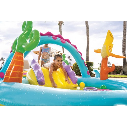 INTEX Dinoland centrum zabaw zamienia każdy ogród w pełen atrakcji wodny świat dinozaurów. To dmuchane centrum ze zjeżdżalnią, prysznicem wodnym i interaktywnymi elementami oferuje dzieciom od 2 lat nieograniczone możliwości zabawy, ochłody i ruchu w gorące letnie dni.