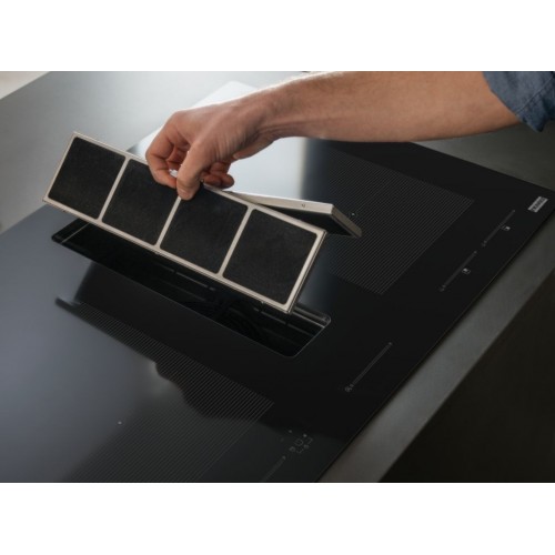 Mythos 2gether Icon Steel FMY 8391R HI to innowacyjne urządzenie typu dwa w jednym, które łączy płytę indukcyjną z wbudowanym okapem, zapewniając wygodę i oszczędność miejsca. Bezramkowa płyta z czarnego szkła może być wpuszczona w blat lub montowana na równi z blatem, tworząc elegancką i spójną powierzchnię. Okap, pracujący w trybie zamkniętym, uruchamia się automatycznie po włączeniu płyty i dostosowuje moc pochłaniania do poziomu intensywności jej pracy. Usuwa on zapachy i cząstki tłuszczu bezpośrednio znad naczyń. Wlot zlicowany jest z powierzchnią płyty, co umożliwia przesuwanie naczyń bez konieczności ich podnoszenia. Płyta oraz okap są obsługiwane za pomocą panelu dotykowego na szkle o białym podświetleniu. Wszystkie elementy elektroniczne, w tym silnik, są wodoszczelne, a dodatkowo zastosowano system gromadzenia wyciekłych płynów. Płyta oferuje 4 pola grzewcze, w tym elastyczną strefę Flexi z możliwością łączenia pól, program automatyczny do roztapiania oraz funkcje: Booster, pauzy z pamięcią ustawień, programowanego czasu działania i szybkiego podgrzewania.