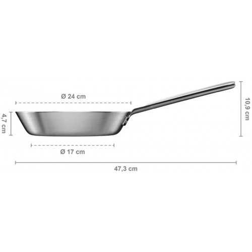 • Wielowarstwowa konstrukcja - patelnia posiada grube 3,5 mm dno z aluminiowym rdzeniem pomiędzy warstwami stali nierdzewnej, zapewniając równomierną dystrybucję ciepła na całej powierzchni.