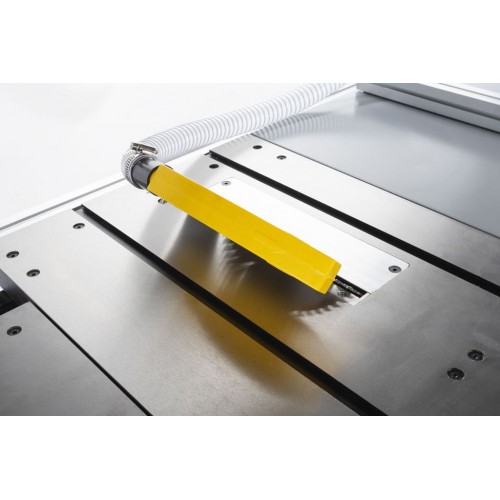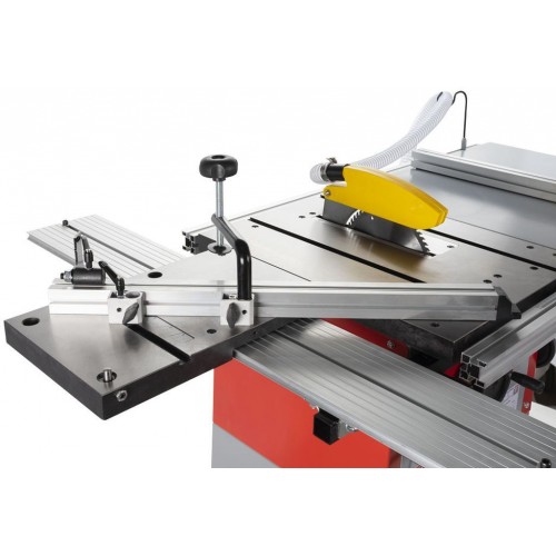 Urządzenie wyposażone jest w stabilny stół żeliwny z przedłużeniem, co zapewnia maksymalną dokładność i komfort pracy nawet przy większych elementach. Płynna regulacja wysokości i kąta tarczy za pomocą pokrętła umożliwia łatwe dopasowanie do różnych rodzajów cięć, a prowadnica równoległa z mikroregulacją gwarantuje precyzyjne prowadzenie materiału.
