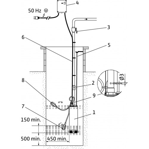 Pompa na prąd zmienny z kablem zasilającym, skrzynką łączeniową (IP55) z termicznym zabezpieczeniem silnika, włącznikiem/wyłącznikiem oraz 2-metrowym kablem zasilającym z wtyczką z uziemieniem Możliwe ustawienie bez zanurzenia w wodzie.