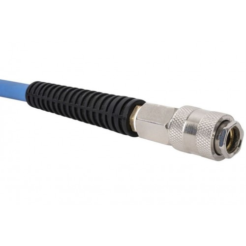 Dzięki 10-metrowemu elastycznemu wężowi wykonanemu ze specjalnej mieszanki gumy i PVC można łatwo dotrzeć do każdego miejsca pracy w tym obwodzie. Wąż sprężonego powietrza jest wyjątkowo miękki, odporny na załamania i ścieranie, chemikalia i oleje, elastyczny i może być używany w temperaturach od +45 °C do -20 °C. Wąż jest również przejezdny dla pojazdów pod ciśnieniem i może być stosowany przy ciśnieniu roboczym do 12 barów.