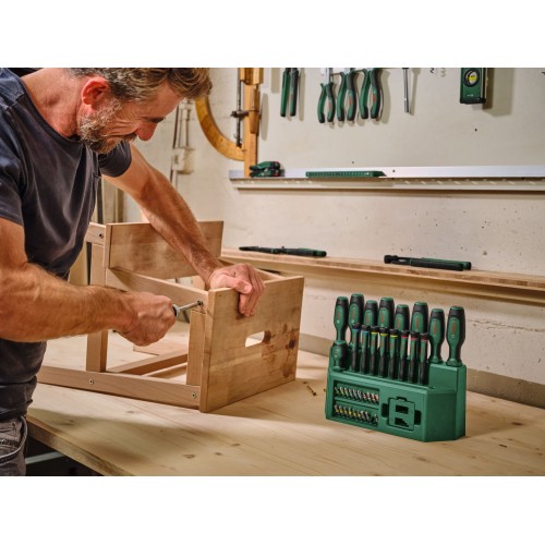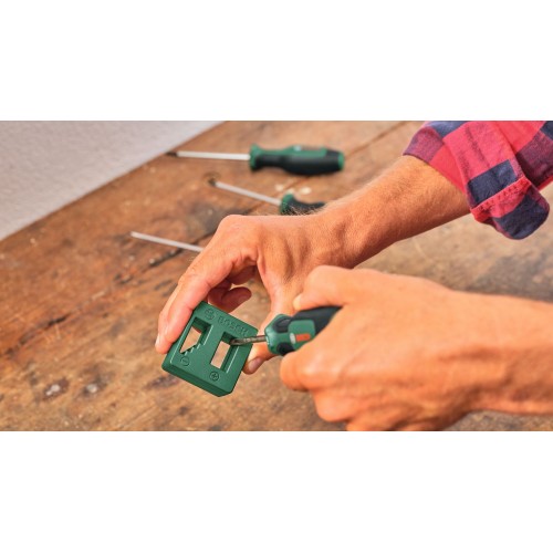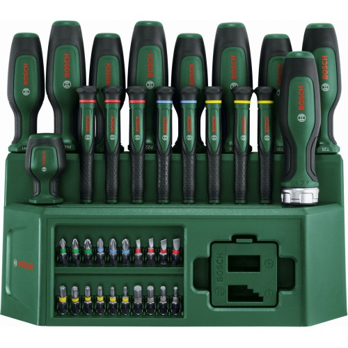 Wykonaj każde zadanie montażowe szybko i efektywnie z wysokiej jakości 39-częściowym mieszanym zestawem śrubokrętów Bosch. Zestaw mieszany zawiera szeroki wybór śrubokrętów: 8 standardowych śrubokrętów (PH1/2, PZ1/2, SL4/6,5, TX20/25), 8 precyzyjnych śrubokrętów (SL1,5/2,5/3, PH00/PH0, TX5/6/8), śrubokręt grzechotkowy, krótki śrubokręt z uchwytem na bity i 20 bitów (PH1/2/3, PZ1/2/3, SL3/4/5/6, TX10/15/20/25/30,40, HEX3/4/5/6). Wszystkie śrubokręty wykonane są z trwałych materiałów. Mają dwuskładnikowe uchwyty z miękkim chwytem dla maksymalnego komfortu. Dzięki kolorowemu kodowaniu typu wybór śrubokrętów i bitów jest łatwiejszy i szybszy. Zestaw zawiera również magnesownik do łatwej magnetyzacji i odmagnetyzacji końcówek śrubokrętów i bitów. Dostarczany w praktycznym stojaku, który można ustawić na stole roboczym, zapewnia uporządkowane przechowywanie i łatwy dostęp.