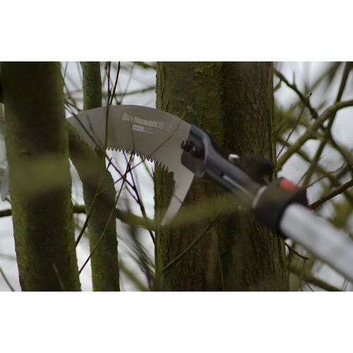 Przycinanie na odległość wymaga niezawodnej i wszechstronnej piły. Zakrzywione ostrze Hayauchi o długości 390 mm jest wyposażone w unikalne zęby 4-RETSUME firmy Silky. Powoduje to duże usuwanie drewna, dzięki czemu można bardzo szybko przecinać najgrubsze gałęzie i zapewnia elastyczność cięcia we wszystkich kierunkach w odniesieniu do słojów drewna. Idealny do większych prac! Ostrze można regulować pod dwoma różnymi kątami, umożliwiając przycinanie zarówno na dużą, jak i na małą głębokość.