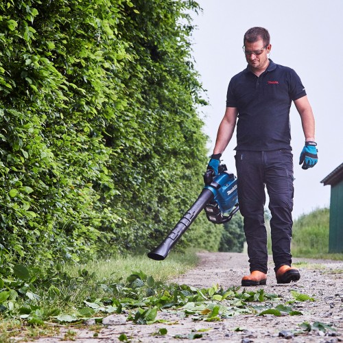 Dzięki bezszczotkowemu silnikowi oraz maksymalnemu przepływowi powietrza do 13,4 m³/min urządzenie skutecznie usuwa mokre liście, skoszoną trawę i drobne zanieczyszczenia. Szybka zmiana funkcji na odkurzacz (zestaw do zasysania w komplecie) oraz noże rozdrabniające redukują objętość zasysanego materiału, zwiększając pojemność worka. W zestawie znajdują się 2 akumulatory BL1850B (5,0 Ah) oraz podwójna szybka ładowarka DC18RD.