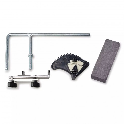 W zestawie kamień do regulacji ziarnistości kamienia szlifierskiego, skórzany kamień polerski i szablon kątowy.