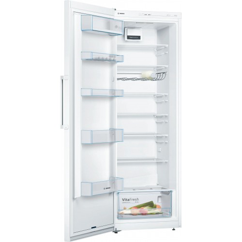 Bosch Serie 4 KSV33VWEP to praktyczna lodówka wolnostojąca o wymiarach 176 × 60 cm i głębokości 65 cm, zaprojektowana z myślą o codziennym komforcie i dłuższej świeżości żywności. Dzięki szufladzie VitaFresh zapewnia optymalne warunki przechowywania świeżych produktów, aby owoce i warzywa dłużej zachowały witaminy, a Ty mógł ograniczyć marnowanie żywności.