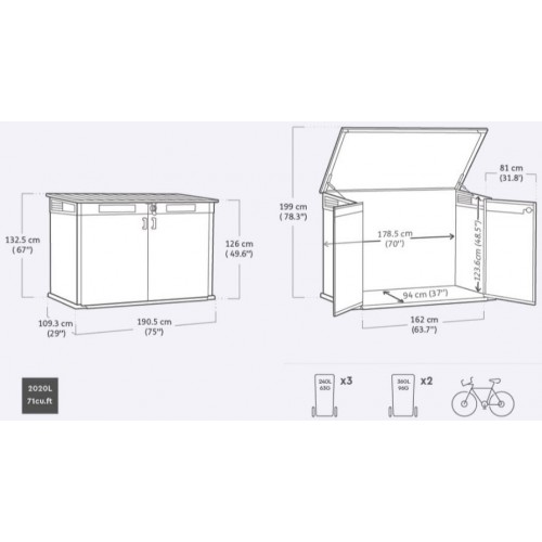 Czy Twoje narzędzia ogrodowe lub warsztatowe w garażu przeszkadzają i musisz znaleźć dla nich odpowiednie miejsce? Bezobsługowa skrzynka ogrodowa Keter Signature powiększy przestrzeń do przechowywania w Twoim ogrodzie, podwórzu, tarasie lub pergoli. Można jej również używać do przechowywania od 2 do 3 pojemników na śmieci. To zależy od ich wielkości. Skrzynia ochroni Twoje rzeczy przed czynnikami atmosferycznymi, takimi jak deszcz. Dodatkowo przechowywane przedmioty są zabezpieczone przed zabrudzeniem.